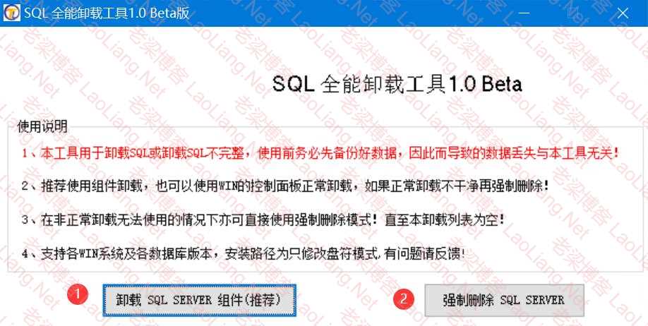 1、本工具用于完整卸载MSSQL,使用前务必先备份好数据,因使用该工具而导致的网站或系统数据丢失与本工具无关!