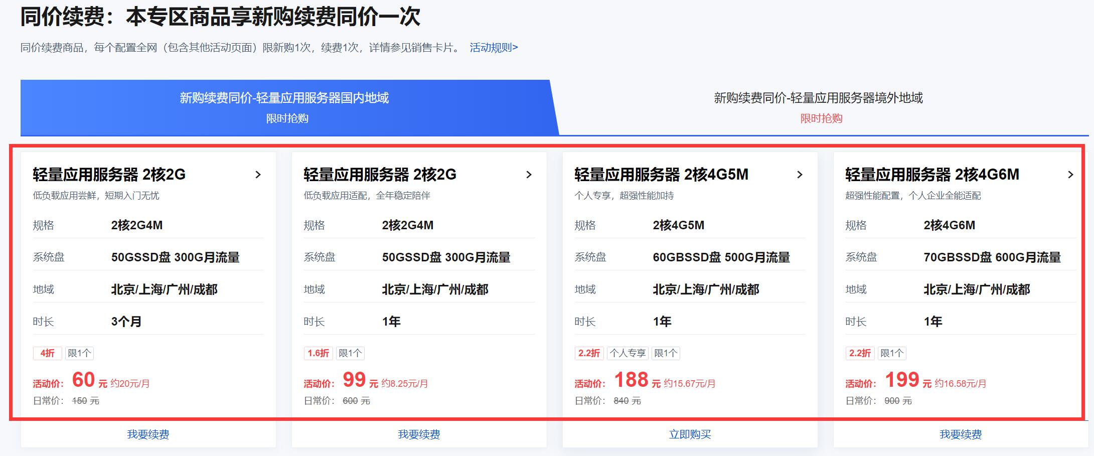 轻量应用服务器-境内:单个用户新购1次,优惠续费1次,可参与活动配置:【同价续费专区】2核2G4M(50G系统盘300G流量)、2核4G5M(60G系统盘500G流量)、2核4G6M(70G系统盘600G流量)与【首单特惠专区】、【限时秒杀】2核2G3M(40G系统盘200G流量)、【买赠专区】2核4G5M(60G系统盘500G流量)6个配置只能选其一享受新购优惠1次;可参与的地域:北京、广州、上海、成都;若当前套餐为老套餐不可续费,请前往控制台升级至新套餐;