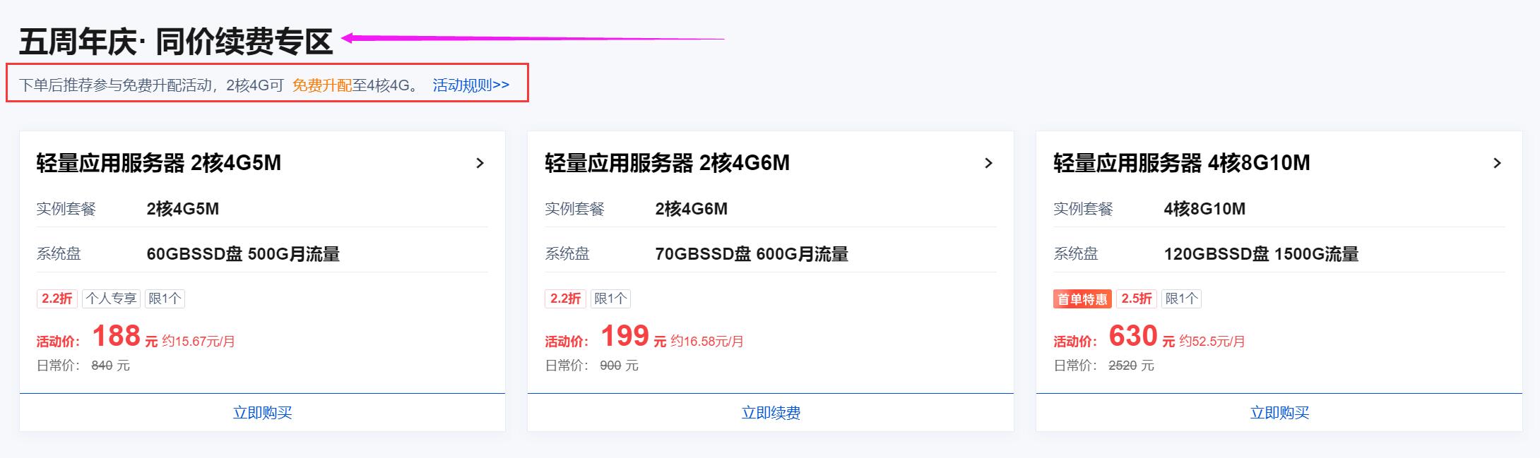 五周年庆· 同价续费专区 下单后推荐参与免费升配活动,2核4G可免费升配至4核4G-是要先续费再升级,否则不具备续费资格,切记!