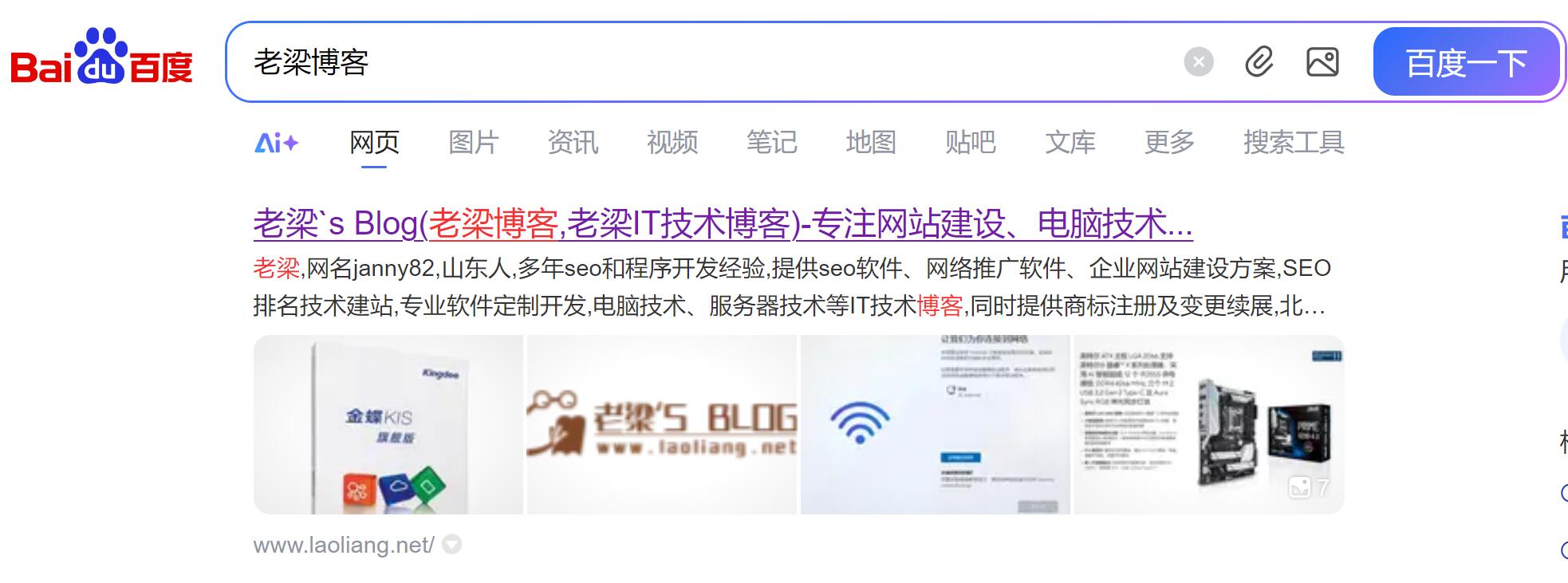 老梁博客网站在百度一直都排在第一位,虽然有另外的一个老梁名人,他也有博客,但一直搜索都是老梁博客在第一位,可是后来因为一些不知道啥问题,突然排名就下降了,一直就没有再出现过,整个来说差不多有一年开外老梁博客已在百度搜索中午排名,今天无意搜索一下,竟然又有了排名~~~