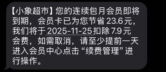 【小象超市】您的连续包月会员即将到期,会员卡已为您节省 23.6元,我们将于2025-11-25扣除7.9元会费,如需取消,请至少提前一天进入会员中心点击“续费管理”进行操作。