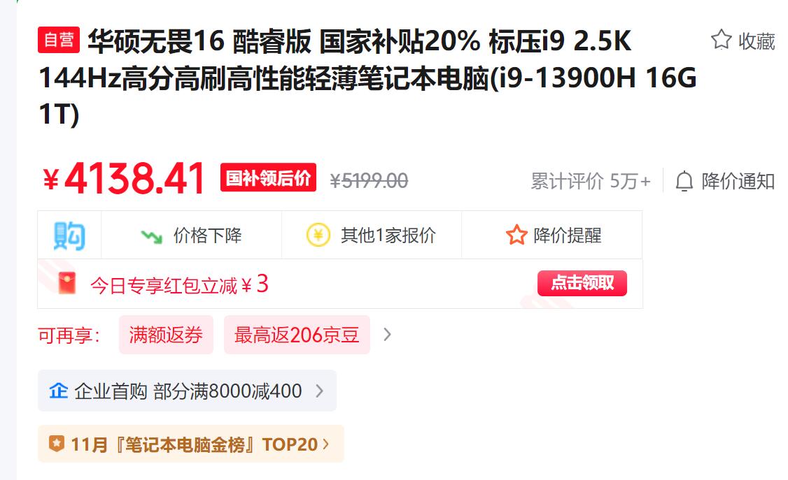 今天说看看笔记本的东西,就看到了京东给推送的笔记本,发现本子也还可以,京东也知道我喜欢标压的东西,京东推送的这个华硕还可以的说“华硕无畏16 酷睿版 国家补贴20% 标压i9 2.5K 144Hz高分高刷高性能轻薄笔记本电脑(i9-13900H 16G 1T)”就这东西,价格4138大洋,确实还是凑合的~~~