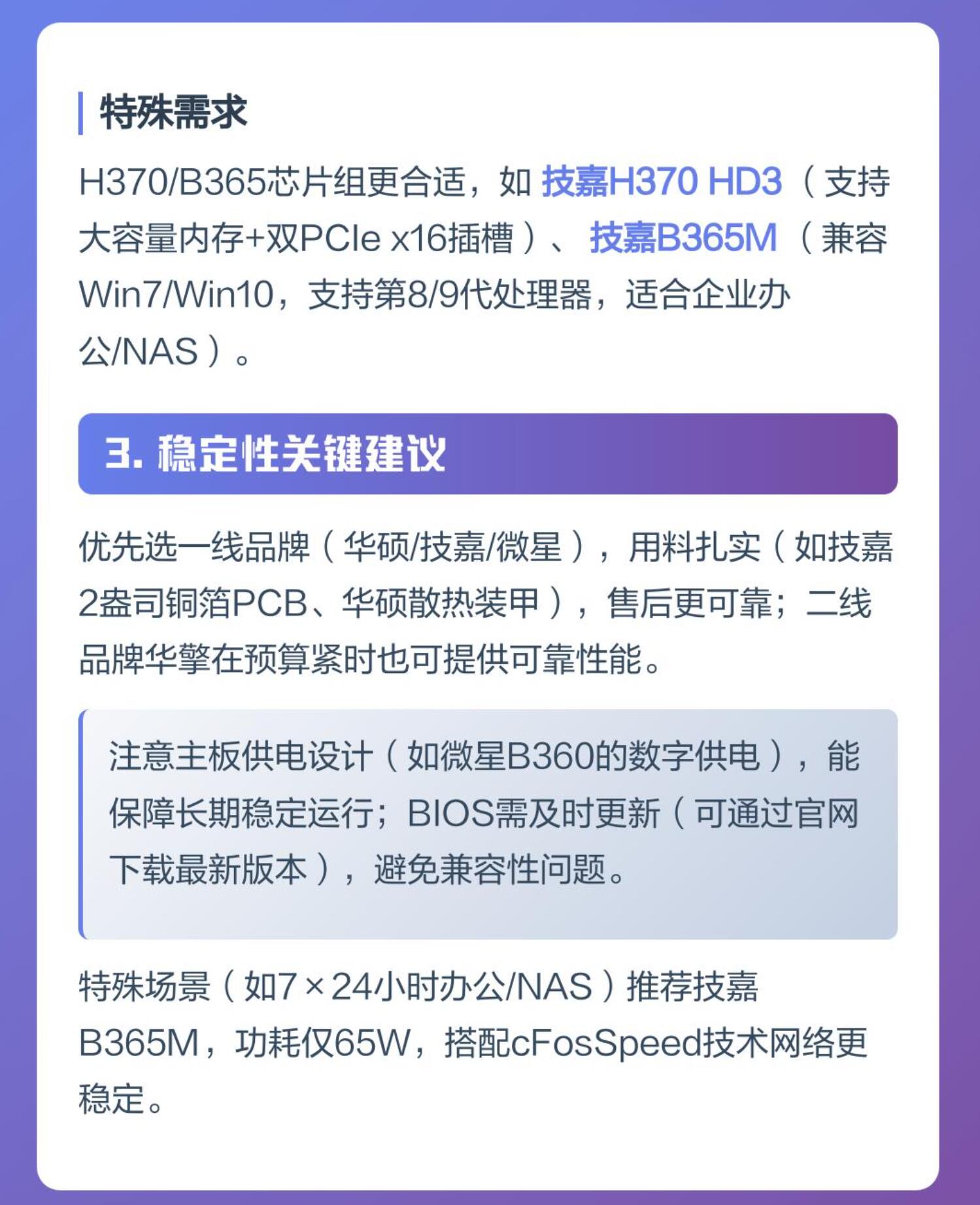 特殊需求:考虑H370/B365芯片组,像技嘉H370 HD3(支持大内存+双PCIe插槽)、技嘉B365M(兼容Win7/Win10,适合办公或NAS使用)。