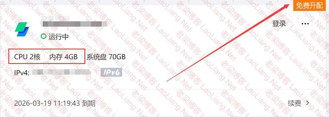 今天想着看一下腾讯云轻量云服务器是不是快到期了,然而看了一下,确实快到期了,日期就要到了,2026-03-19就到期了,然而有了免费升配的提示,如下图所示
