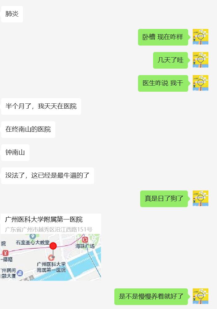 谭爷一般隔三差五就会在群里嘚瑟一下,今天跟耀哥还说,谭爷最近发现得有一个月没有出现在群中,就感觉很奇怪,然而给谭爷发了消息,得知谭爷生病了,谭爷肺炎入院了半个月多了,就感觉不正常,好歹谭爷有消息~~~